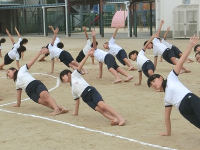 9月14日(水)午後、5・6年生は運動場で、初めて音楽を流しながら「団体演技」の練習を行いました。
