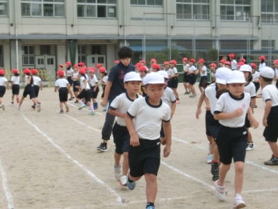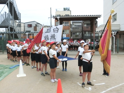 運動場は少しぬかるんでいる所もありましたが、校旗や優勝旗、応援団旗などを持って開会式入場【写真左・中】と閉会式退場【写真右】の練習を行いました。入場行進では腕の振り方や足の運び方、入場の合図などの確認を行いました。全学年による全校競技「紅白対抗なかよしころがし」の入退場と場所移動の練習も行いました。本番では、足並みがそろった入場行進や演技・競技を観ていただき、感動と喜びを与えられる素晴らしい運動会になるよう、子どもたちは頑張っています。