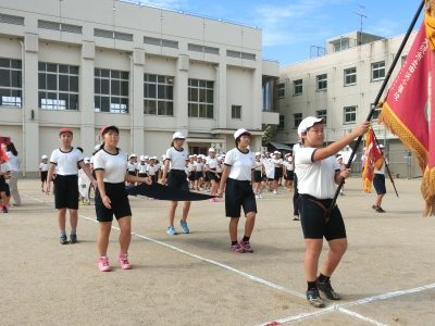 校旗・校章旗・優勝旗・準優勝楯をもった6年生が先頭で、全員が大きく手を振って元気よく入場行進しましました。開会式では児童代表2名の力強い「児童宣誓」の後、運動会のうた、はじめの体操、応援合戦など、本番さながらの進行でリハーサルができました。