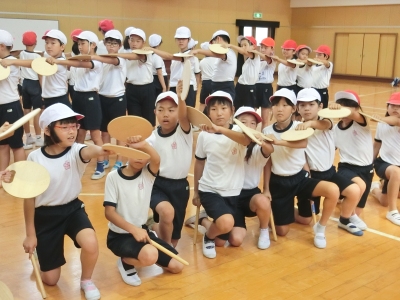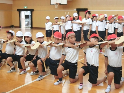 3・4年生は雨のため、体育館で団体演技の合同練習を行いました。創作エイサー「イチャリバ チョーデー」の最終の仕上げで、美しい「片手波」の動きを確認しました。当日は、紫のはっぴを着て、出会いを大切にする心を込めて踊ります。あたたかく見守ってください。