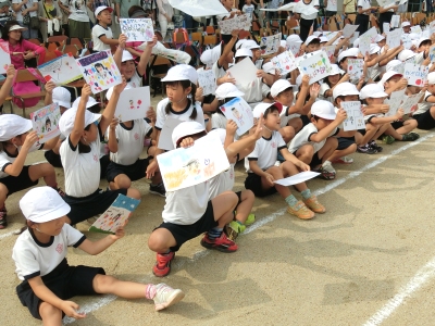 開会式に引き続き、「赤・白」の「応援合戦 Stand up〜立ち上がれ!中浜の勇者たち〜」で戦いの火ぶたが切られました。今からやるぞという気合と結束を示してくれました。応援合戦に勝ち負けはありませんが、迫力満点の気持ちのこもった応援に、見ている大人たちも勇気と感動をもらいました。児童席では、赤・白のボードを持って、ウェーブと大きな声援で、全員が参加していました。