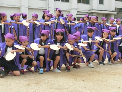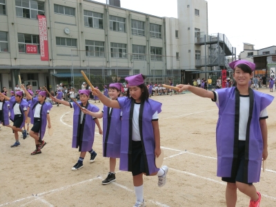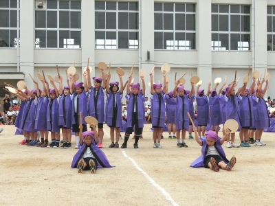 3・4年生の団体演技は、パーランクーを用いた「創作エイサー」です。「イチャリバ チョーデー」とは、「出会いを大切にする心」という意味です。沖縄の伝統芸能「エイサー」を浦島太郎の「海の声」の曲に合わせて踊りました。いきいきとした表情で、とても楽しそうに踊っていました。