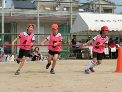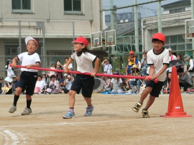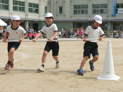 3年生の団体競技は、「強風注意報!台風の目!」です。3人が1本の棒を横に持ち、勢いよくコーンをまわっていき、ターンをしてスタート地点に戻れば、棒を上と下から通して、次へバトンします。チームワークが勝敗を分けます。なかには勢いあまって、振り放されそうになる児童もいましたが、3人が協力してうまくまわっていました。