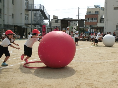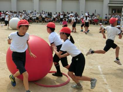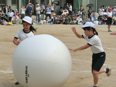今年度の全校競技は、大玉ころがし「紅白対抗なかよしころがし」です。赤組白組とも1・2年生、3・4年生、5・6年生の3チームに分かれて、大玉ころがしを3回戦行いました。得点競技のため、競技に出ていないときは、必死に応援をしていました。