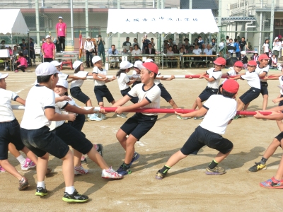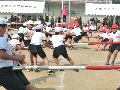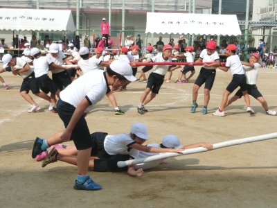 4年生の団体競技は、毎年恒例の「棒引き」です。素早い動きと力のいる競技です。5本の棒を奪い合って、自陣に多く引き込んだら勝ちです。倒れても棒にしがみついているチームもありました。