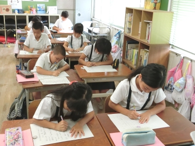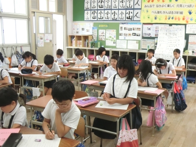 10月5日(水)1限、3年生は「運動会の作文」を書いているところでした。団体演技の創作エイサーのこと、団体競技の台風の目、大玉ころがしのこと、かけっこのことなどについて書いていました。「最初、はっぴを着るのが恥ずかしかった。間違えずに踊れてよかった。個人走で1位になりたかった。家族に褒められて嬉しかった。」など、さまざまな感想を書いていました。