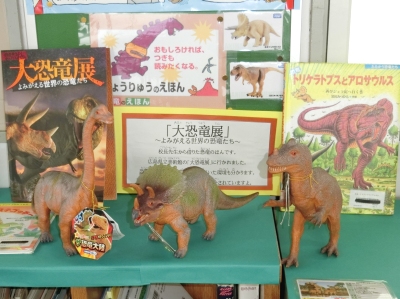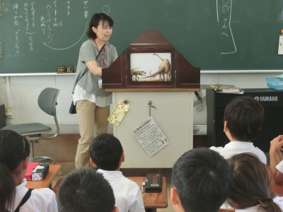 2年1組では図書館補助員さんの「読み聞かせ活動」がありました。今日の紙芝居は「ブラキオサウルのかぞく」でした。草食恐竜は大量の葉っぱを噛まずに飲み込むので、胃袋にためた石ですりつぶすそうです。東校舎2階のミニ図書館には、新たに「恐竜コーナー」【写真中】も作り、校長先生の本も置いています。せひ、恐竜のことも調べてみましょう。