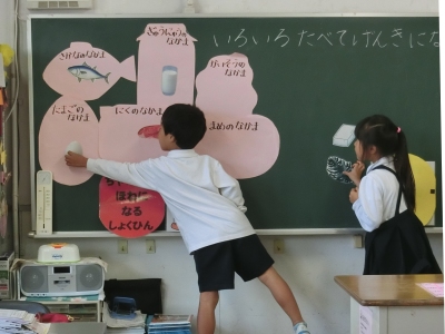 血や肉や骨になる食品(赤)・熱や力になる食品(黄)・体の調子を整える食品(緑)について、シルエットクイズをしました。黒板のシルエットに食べ物カードをはって、みんなで学習をしました。
