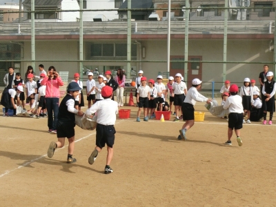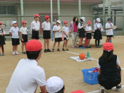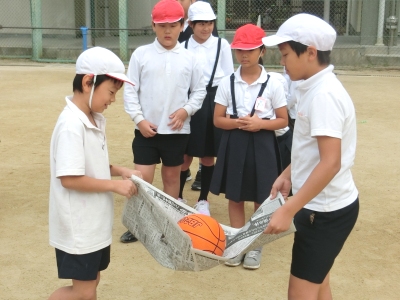 新聞紙の上にバスケットボールを乗せて、なかよし班のペア2人で走って運びます。なかよし班の奇数班と偶数班が組んで、リレー競争を行います。最初に集会委員による説明【写真左】と見本がありました。初めてのゲームで要領がつかめないようでしたが、リレーが進むにつれて、班で作戦をたてて工夫をしてボールを運んでいました。