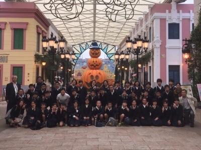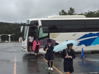 11時にバスは「志摩スペイン村」に到着しました。今年もスペイン村を訪れるバス組の中では、一番乗りでした。まだ外は大粒の雨が降っていますので、エスパーニャ通りで集合写真を撮りました。これからは、活動班に分れて行動します。