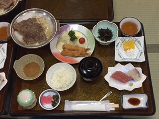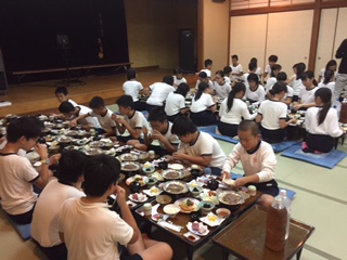 17時20分からは入浴、18時10分から舞台付きの大広間で夕食でした。献立は、「牛陶板焼き、海老フライ、お造り、茶碗蒸し他」のご馳走でした。食事係の合図で「いただきます」をし、志摩スペイン村での楽しかった出来事をおしゃべりしながら、食事をいただきました。