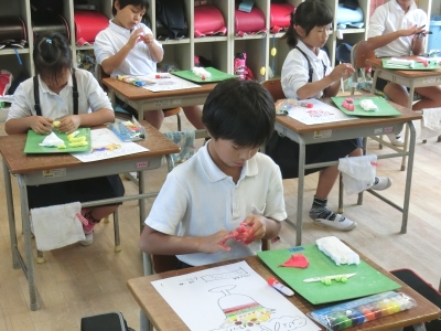 10月28日(土)2限、2年2組【写真左】は、作品展の「パフェ作り」を行いました。紙粘土に絵の具で色をつけて、イチゴやリンゴ、バナナなどのフルーツやお菓子を作っていました。
