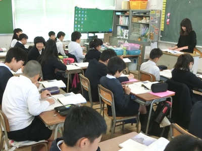 6年生【写真右】は、国語の授業で「海のいのち」(立松和平文)の学習です。文を初めて読んだ感想を書き、「瀬、甲板、共鳴」などの意味調べをしていました。