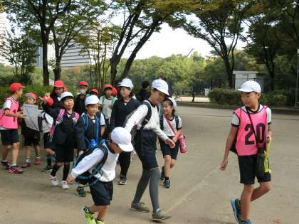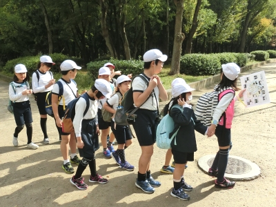 今年度の全校遠足のめあては、「にっこり警報が出るような、笑顔あふれるハッピースマイルウォークにしよう」です。オリエンテーリングの各ポイントでは、どんな課題がでるのか楽しみで、少しドキドキします。「太陽の広場」での開会式のあと、ルール説明があり、10時に1班と11班から順にポイントに向かって出発しました。