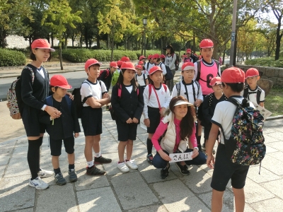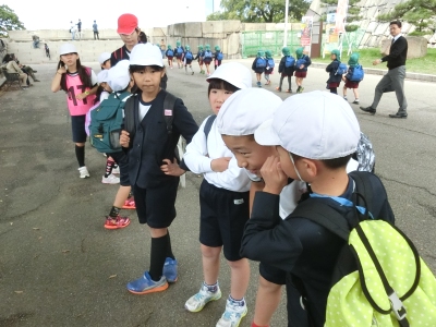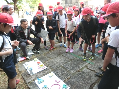 ポイント1は青屋門で「鼻歌イントロ」【写真左】、ポイント2は極楽橋で「輪なげ」【写真中】、ポイント3は天守閣で「伝言ゲーム」【写真右】を行いました。なかよし班のみんなで協力して、ゲームやクイズに挑戦しました。