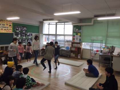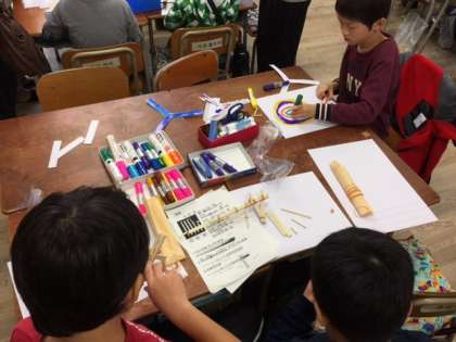 写真左から「手作り工作」は、わりばしを使って作るわりばし鉄砲です。みんな真剣な顔をして作っていました。「片足すもう」は、教室が土俵に早変わり。雰囲気ばっちりで、安全に配慮してひもを引っ張り合う勝負でした。「シャボン玉体験」は、いろいろな色のシャボン玉を作って、最後には自分だけのアートが完成しました。