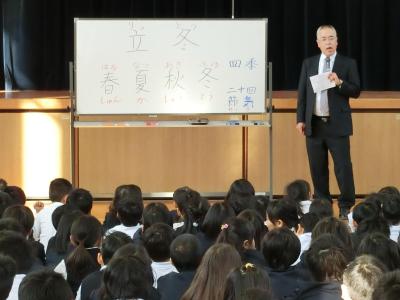 11月7日(月)、今日は暦のうえでは冬が始まる「立冬」です。児童朝会では、校長先生から「四季・二十四節気」と冬をむかえるにあたって、気をつけてほしい3つのお話がありました。