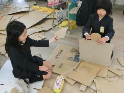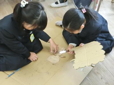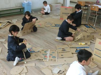 それぞれが考えたロボットをデザインして、段ボールで部品を作ってロボットを完成させていきます。教室の机・椅子を片づけてから、ハサミやナイフを使って、段ボールを切り刻んでいました。果たしてどんな「ロボット工場」が完成するでしょうか。