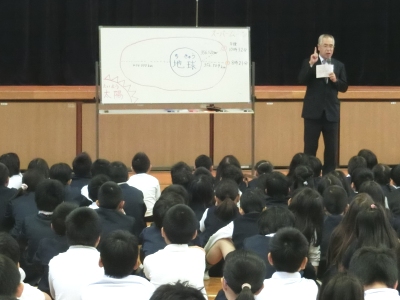 11月14日(月)始業前、今日の児童朝会は校長先生から今週の「七五三とスーパームーン」についてのお話でした。