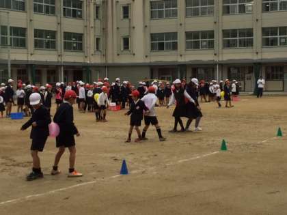 運動場で「風船リレー」 ≪児童集会≫