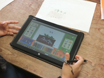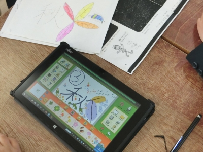 タブレットPCを使って、11月に学習園で掘りおこした「サツマイモ」に関するクイズをお絵かきソフトで作成していきました。「表紙・問題・答え」の担当に分かれて、サツマイモの茎の名前は、甘く食べる方法はなどのクイズを考えて、上手にお絵かきをしていました。