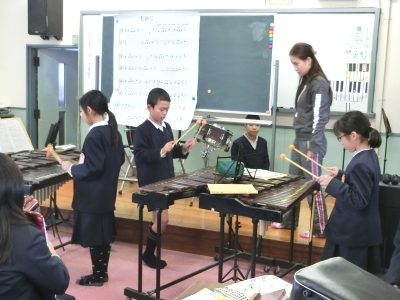 「威風堂々」は1901年にイギリスの音楽家エドワード・エルガーが作曲をした管弦楽のための行進曲で、第1番の中間部の旋律は特に有名です。児童が木琴・鉄琴・アコーディオン・ソプラノ笛・打楽器などのパートに分れて、個別練習をしていました。その後、CDで管弦楽の曲を流しながら、パート別に演奏をしました。最後は、一度だけ全員で旋律の移り変わりに注意して合奏をしましたが、曲想を生かして合奏するのはなかなか難しく、まだまだ練習が必要です。