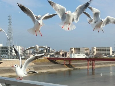 【写真右は、大和川河口(堺市堺区鉄砲町)の「カモメ」の群れです。】