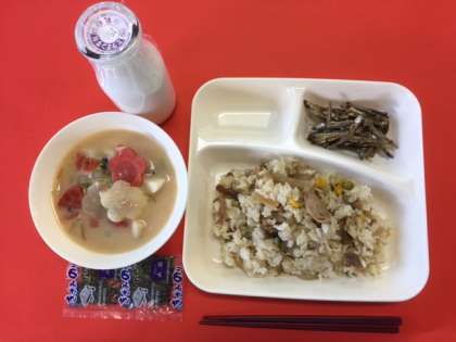 1月11日(水)、今年初めての給食は、正月の行事献立で「きんぴらちらし、ぞう煮、ごまめ」でした。
