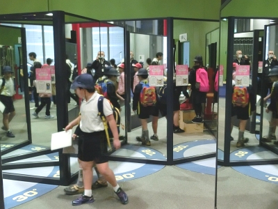 科学館の4階「宇宙とその発見」では、「ノーベル賞と大阪」のコーナー【写真左】を熱心に見て、3階「身近に化学」では、人が作るにおいの所でいろいろな香りを楽しみました。2階「親子で科学」では、鏡に囲まれた「何人にみえる?」【写真中】などで科学の世界にふれることができました。1階「電気とエネルギー」では、ジョギング発電【写真右】で、走って発電体験をしました。今日はとても充実した一日でした。