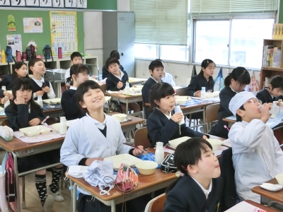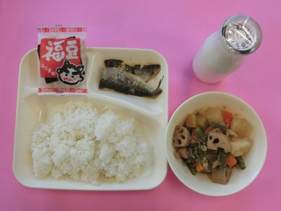 今日の給食は「節分の行事献立」で、「いわしの生姜醤油がけ・含め煮・いり大豆」でした。東校舎2階低学年の教室をまわると、どの学年もインフルエンザ予防のため、全員が前を向いて食べていました。インフルエンザが流行していますので、50秒間しっかりと手洗いをしましょう。