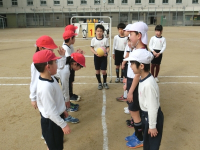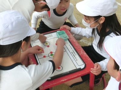 パス回し、シューティング、3対2のチーム練習の後、練習試合を行いました。審判も自分たちで行いました。前半の試合が終わってからの作戦タイム【写真中】では、ボードを使ってチームで話し合い、後半に活かしました。最後は活動を振り返って、友だちの良い動きやチームの作戦でうまくいったことを発表しました。