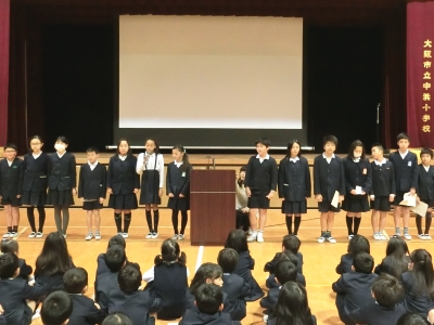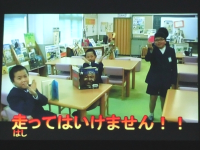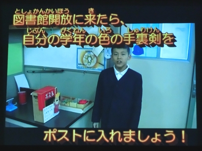図書委員20名の皆さんが協力をして制作したビデオを観賞しました。本は種類ごとにアイウエオ順に並べる、2人以上で本は読みません、図書館開放に来たら自分の学年の手裏剣をポストにいれる、新刊コーナーの本は貸出できないなど、図書室内でのルールについて発表がありました。児童の読書意欲の醸成と読書習慣の定着を図るために、今後も図書室やミニ図書館などの読書環境の整備・充実を図っていきます。