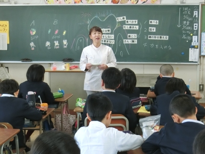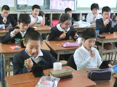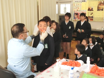 2月16日(木)2限、4年生は歯みがき指導と「フッ化物塗布」を受けました。