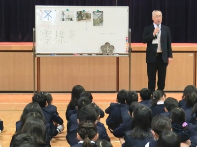 2月20日(月)始業前、今日の児童朝会は、校長先生から「大阪市章と中浜小学校校章」のお話でした。