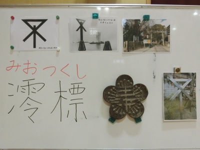大阪市章は「澪標(みおつくし)」といって「水路の杭」という意味があり、明治27(1894)年に制定されました。中浜小学校の校章は、梅の花の中に「中浜」という漢字が書かれており、創立時に校章が決まったようです。昭和33(1958)年には2,431人いた児童も、東中浜小学校の独立、昭和54(1979)年の森之宮小学校の新設により、平成にはいってからは200人程度の児童数になりました。児童数の推移や先週に開催された適正配置に向けた「保護者説明会」の内容についてもお話がありました。