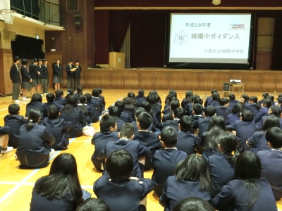 2月22日(水)午後、6年生は多くの児童が進学する城陽中学校へ「中学校ガイダンス」に出かけました。中学校では本校卒業生の2年生がお世話役として、校内の案内をしてくれました。