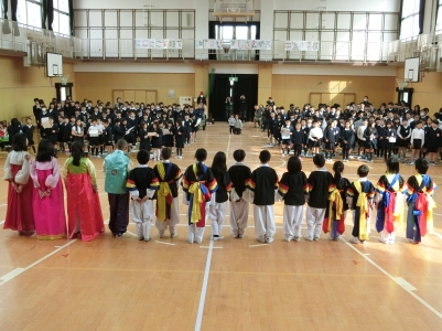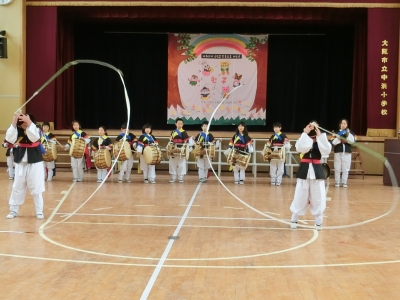 3月6日(月)午後、体育館で「民族校内発表会」があり、全校児童が鑑賞しました。民族クラブの全児童が「プンムル(農楽)」を行いました。チャンゴやプㇰ、ケンガリ、チン、ソゴの5つの楽器を演奏をしながら登場しました。キッパルチュム(旗の舞)やサンモ(帽子のリボンを廻す)【写真左】、ファルソギ(弓矢)もあり、躍動感のある素晴らしい演技でした。