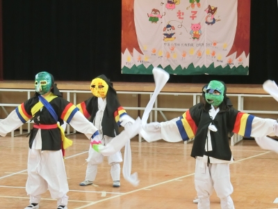 次にお面をつけて「タルチュム(踊り)」【写真中】を披露しました。民族クラブに関するクイズをし、6年生がソルチャンゴを演奏し、全員で「アリアン」【写真右】を歌いました。最後に6年生からは、卒業を迎えてのアピールがあり、見ている児童に感動が伝わった発表会でした。