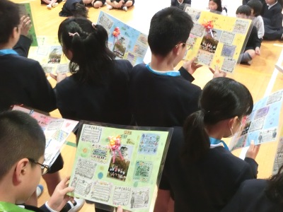 最後は、「みんなで歌おう」です。この1年間のなかよし班活動の映像をスライドショー【写真右】で流しながら、214人全員で『キセキ』の歌を合唱しました。アンコールがあり、2回歌いました。