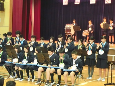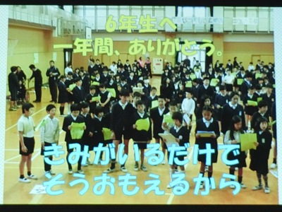 続いては、「卒業生の皆さんへプレゼント」です。昨年11月の全校遠足「ハッピースマイルウォーク」の記念写真と、一人一人からのメッセージが添えられた「カード」【写真左】が5年生から卒業生に手渡されました。そして、卒業生から在校生へは、自分たちで作った「ぞうきん」が各学年の代表に手渡され、合奏曲「サンバデジャネイロ」の曲がプレゼント【写真中】されました。