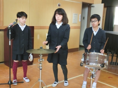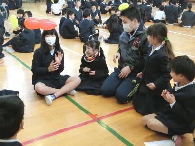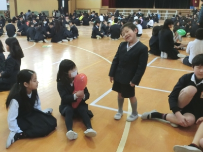 3月9日(木)始業前、今日の児童集会は、「思い出ゴロゴロドカン」でした。なかよし班で円になり、風船を回して【写真左】、シンバルの音がなった時【写真中】に風船を持っていた人は、一年間にあった班活動での思い出を発表します。