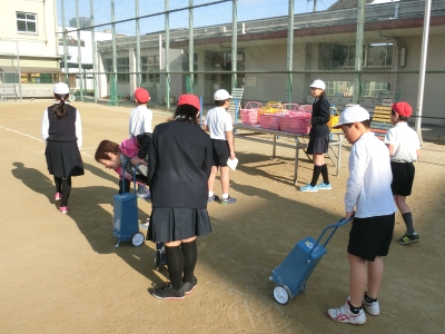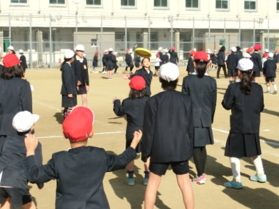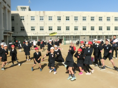 なかよし班対抗のドッチビー(フリスビーのような柔らかい円盤)を投げて、相手をねらうゲームです。ルールはドッジボールと同じですが、途中からドッヂビーが2つになりました。当たってもぜんぜん痛くないので怖くありませんが、キャッチは難しいので逃げるのに必死でした。歓声をあげて、楽しんだひと時でした。