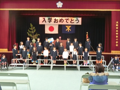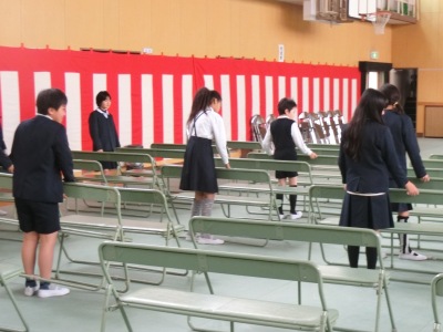 4月6日(木)午前、入学式を明日に控えた今日、新6年生と新2年生が登校してきました。新6年生【写真左】は入学式準備のため、講堂の椅子を並べたり、掃除や掲示のお手伝いをしました。その後、新2年生【写真中】の26名は準備の整った式場で、新1年生の前で披露する「歓迎のことば」の最終練習を行いました。