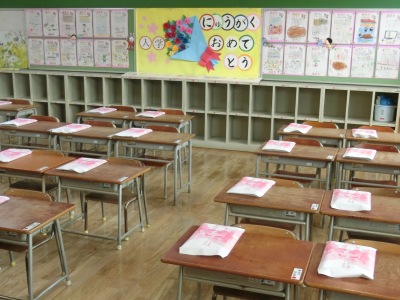 1年生の教室【写真右】の準備も整い、いよいよ明日、新1年生をお迎えします。明日の入学式は、午前10時開式です。保護者の方々のご来校時刻は、午前9時40分となっています。