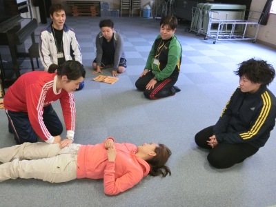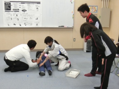 給食担当教員からは、個別対応給食の提供について話があり、その後、「学校管理下における食物アレルギーへの対応」のDVDを視聴しました。実技研修では、養護教諭が講師になって、アナフィラキシーやエピペンの使い方について研修を行いました。最後は2班に分かれて、緊急時対応のロールプレイ【写真左・右】を行い、教職員の共通理解をはかることができました。