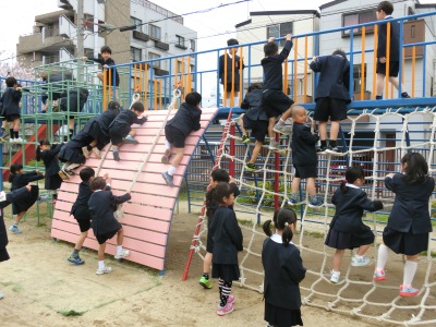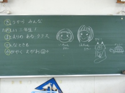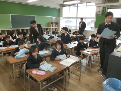 2年生【写真左】の教室をのぞくと、ちょうど担任の先生が学年だよりを配って、話をしているところでした。年度当初でたくさんのプリントが配られました。3年生【写真中】では新しい担任の先生が、自分の名前の語呂合わせで「学級目標」を話したあと、自己紹介をしていました。1年生【写真右】は教室で2列に並ぶ練習をしたあと、休み時間になって「なかよし広場」で遊んでいました。「よく学び、心やさしい、たくましい子ども」に育ってくれると思います。