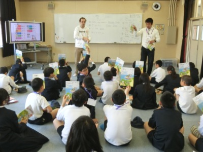 4月14日(金)3限、5年生は「初めての外国語活動」の授業でした。隔週金曜日は、担当の先生と昨年度から来られているC-NET(City Native English Teacher)の先生とともに、外国語活動を行っています。