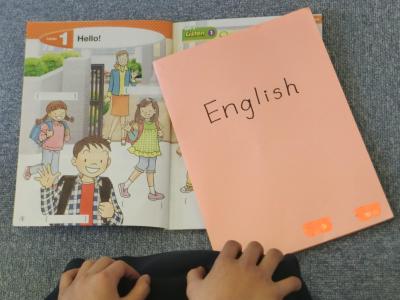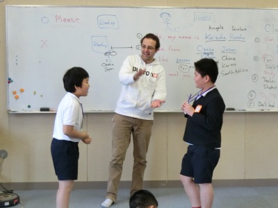 5年生は今日が初めてなので、授業中のルールを決めていきました。その後、文部科学省外国語活動教材 "Hi friends!"【写真中】 Lesson1の世界のあいさつについて学習しました、 "Hello,my name is ‥" "I am from ‥" "I like ‥" "Nice to meet you" など、ペアになってあいさつの学習【写真右】をしていきました。子どもたちは、少し照れながらも英語の発音に慣れ親しんでいきました。