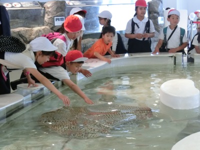 ふれあい体験水槽【写真左】では、目の前を泳ぐエイやサメを触って、ザラザラ、ヌルヌル感など、生き物たちを肌で感じていました。約1時間半、海遊館の館内を楽しく見学することができました。