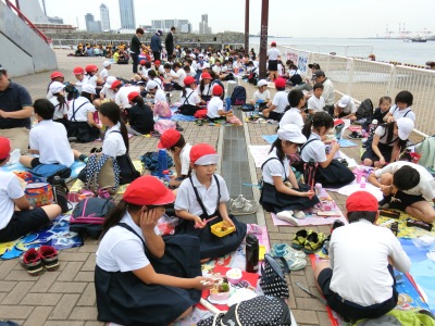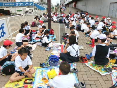 雨の心配がありましたが、お昼ごはんの場所【写真中・右】は、帆船型観光船「サンタマリア」の乗り場の横にシートを広げることができました。なかよし班で、海や行きかう船を眺めながら、おいしいお弁当をいただきました。
